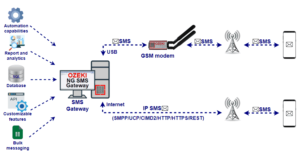 The diagram illustrates how can Ozeki NG SMS Gateway be used as a business SMS Gateway. It collects messages from various sources such as Excel sheets, databases reports and analytics. Its automation capabilities, customizable features and bulk messaging capabilities can offer a great deal for businesses. The gateway has two methods of sending messages: through a GSM modem connected via USB, which sends SMS directly to the mobile network and onward to phones, or via the internet using different protocols, also routing SMS to the mobile network and phones. This setup ensures rapid and efficient delivery of numerous messages.