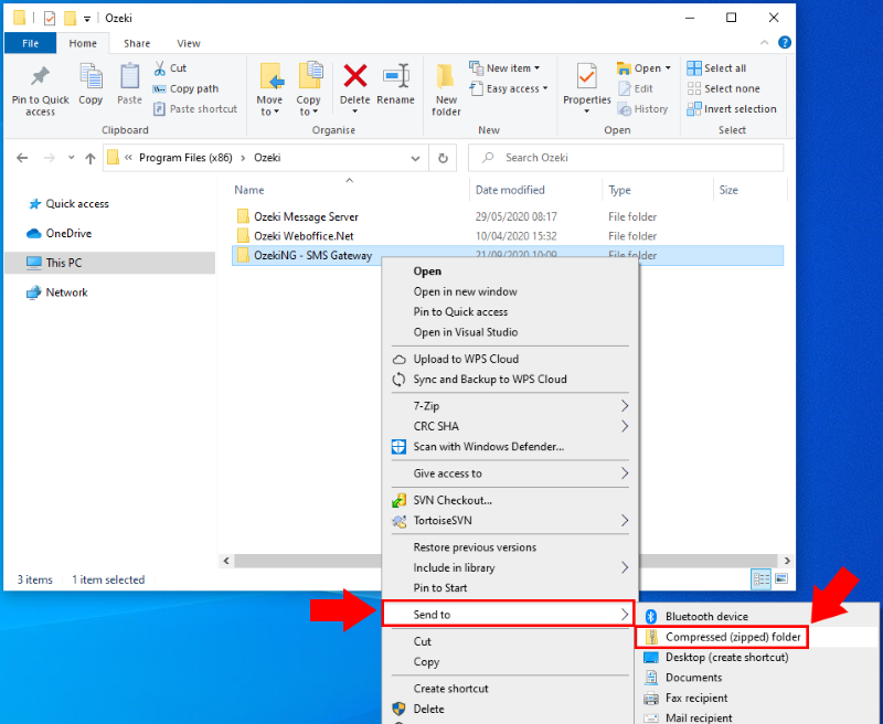 Once the Ozeki NG service is stopped, you need to locate the Ozeki NG Data folder. You can find it in the C:\Program Files (x86)\Ozeki\OzekiNG - SMS Gateway. Next compress it into a Zip file. Right click on the folder then select "Send to" and "Compressed (zipped) folder" (Figure 5).