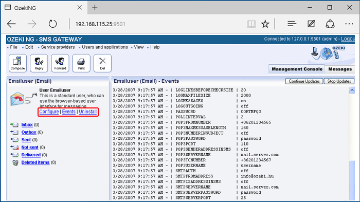 The Ozeki NG - SMS Gateway software acts as an e-mail client, using an SMTP server to send, and a POP3 server to receive messages. You can use its graphical user interface to install and configure an E-mail user.