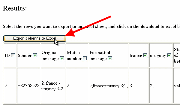 Now I send a test bet. In the SMS text message the follows need to be included: Ordinal number of the match, Team1, Team2, Result of Team1, Result of Team2.